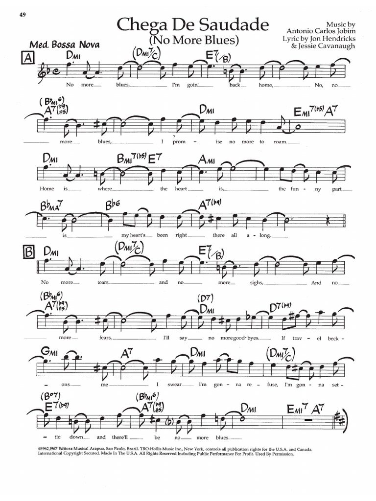 New year means new discount: Web download & print chega de saudade (no more blues) for voice and other instruments (in c) by antonio carlos jobim. Web chega de saudade (no more blues) sheet music for piano (solo) easy | musescore.com. Color allows quick understanding of the sections and form of the tune, the. Chords, lead sheet and lyrics included.