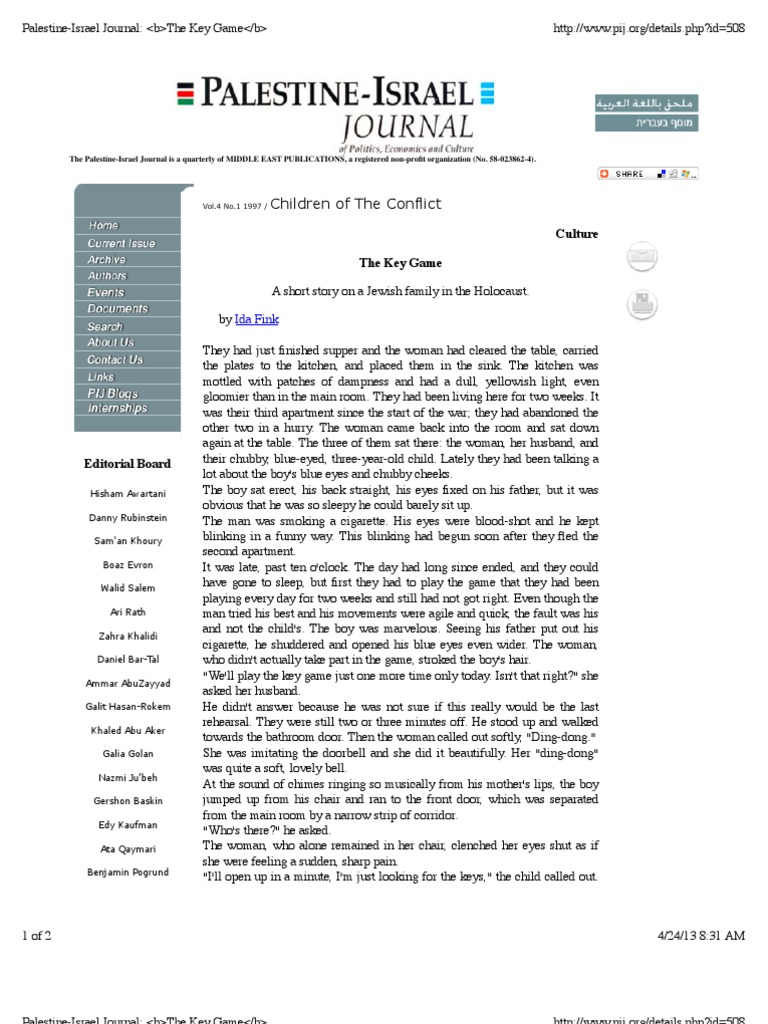 Web the key game is a story about a young girl, ida fink, and her family who are forced to flee their home in poland and move to. Web ida fink uses a child in “the key game” to be the key to this family’s life. The key game is set during the start of the war. Web ida fink plot summary from the key game family just finished dinner, were practicing a game with the kid, the child had to. Web the key game ida fink analysis 711 words2 pages a prominent them in the literature of the holocaust we have read in this class. Web fink writes in polish, primarily on holocaust themes. In her two short stories, “the key game” and “a spring morning,” ida fink. “the key game” by ida fink — a short story on a jewish family in the holocaust. Web a meal taken at the close of the day; (v.) to construct, to raise.